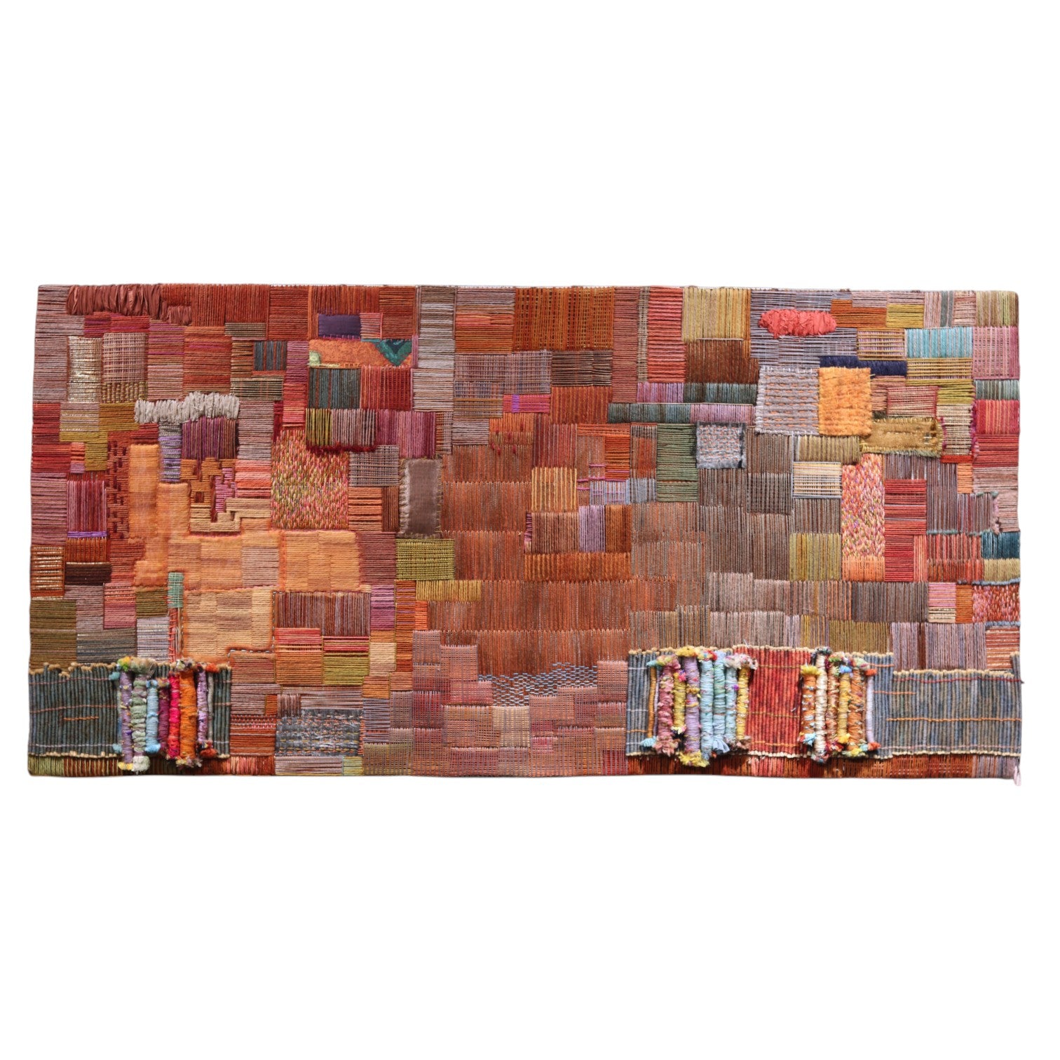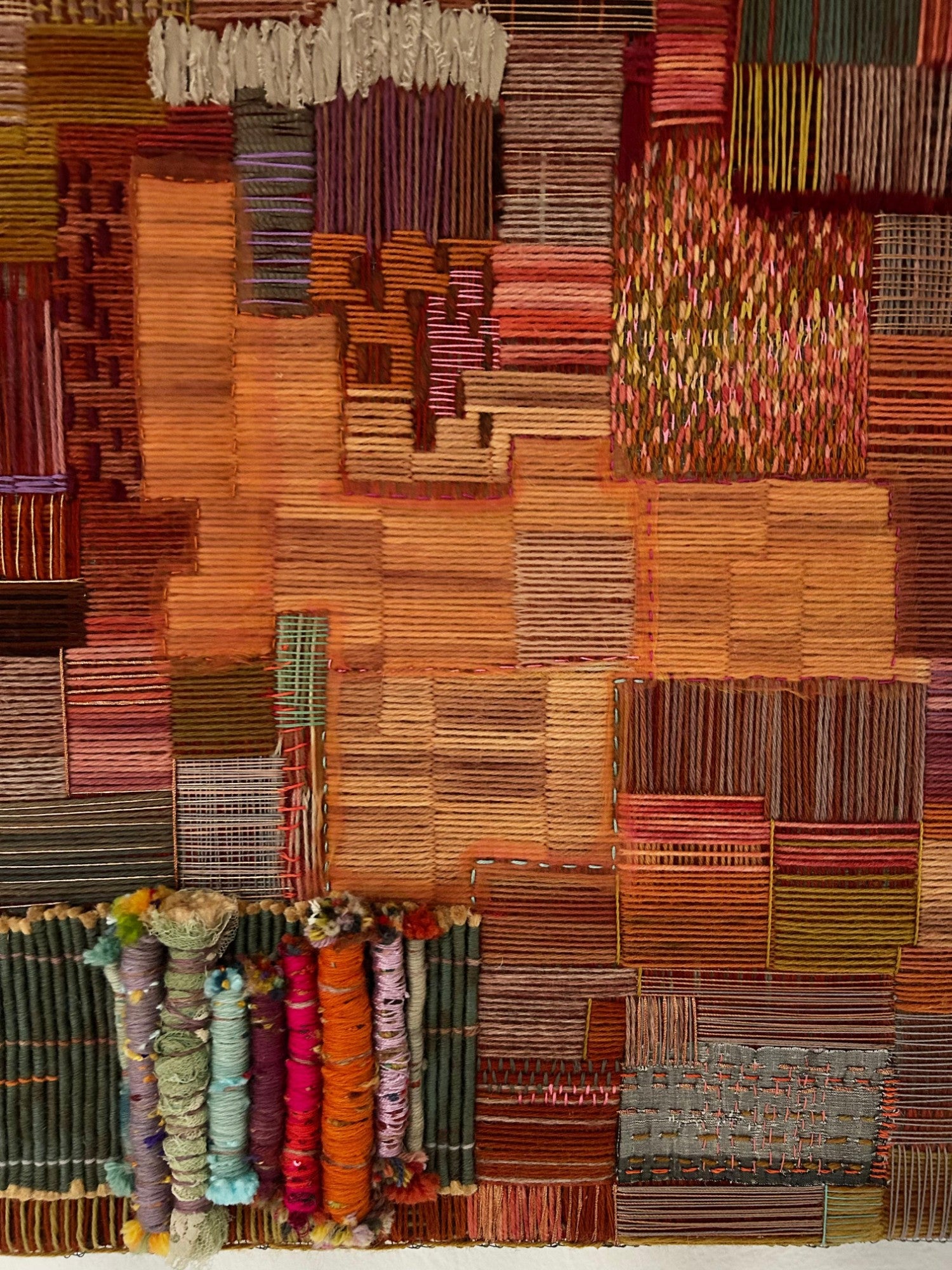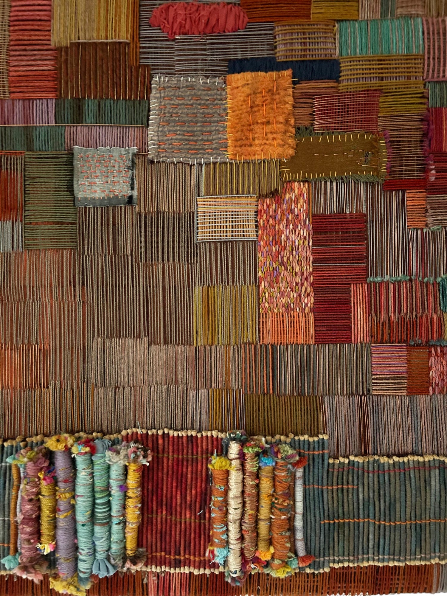 Cuadro Textil bordado sobre malla metálica con lana principalmente y detalles de hilo, tela, yute y diversos materiales.